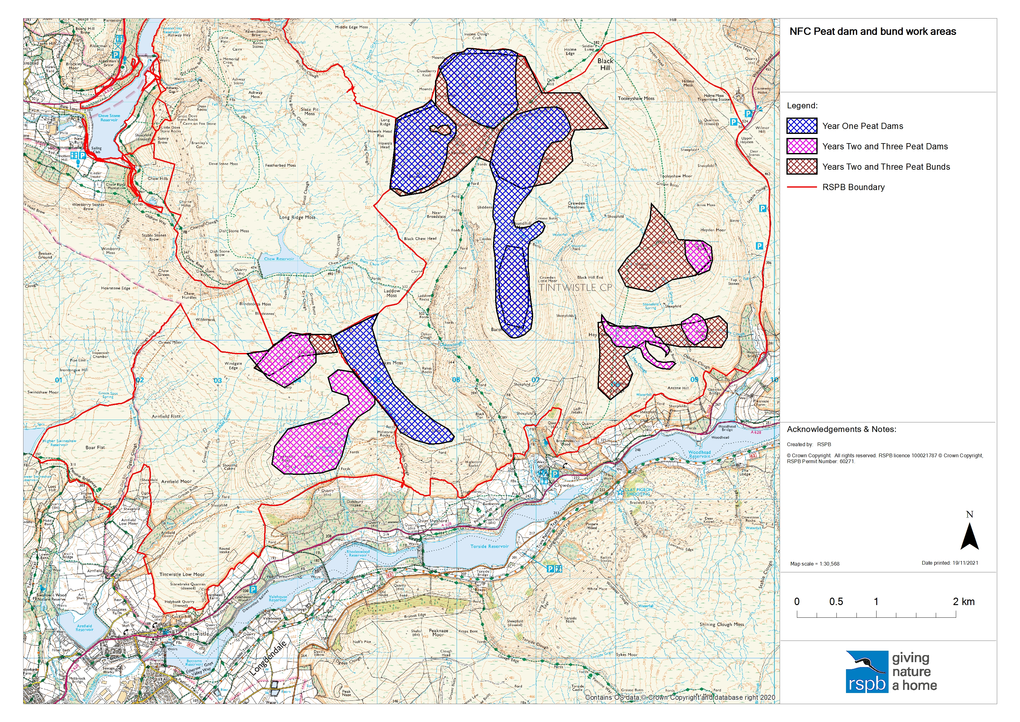 "description": "Install 10,000 peat dams or bunds over the period September 2021 to March 2025 on United Utilities' and RSPB's Dove Stone estate, focusing specifically on the Crowden and Arnfield tenancies",