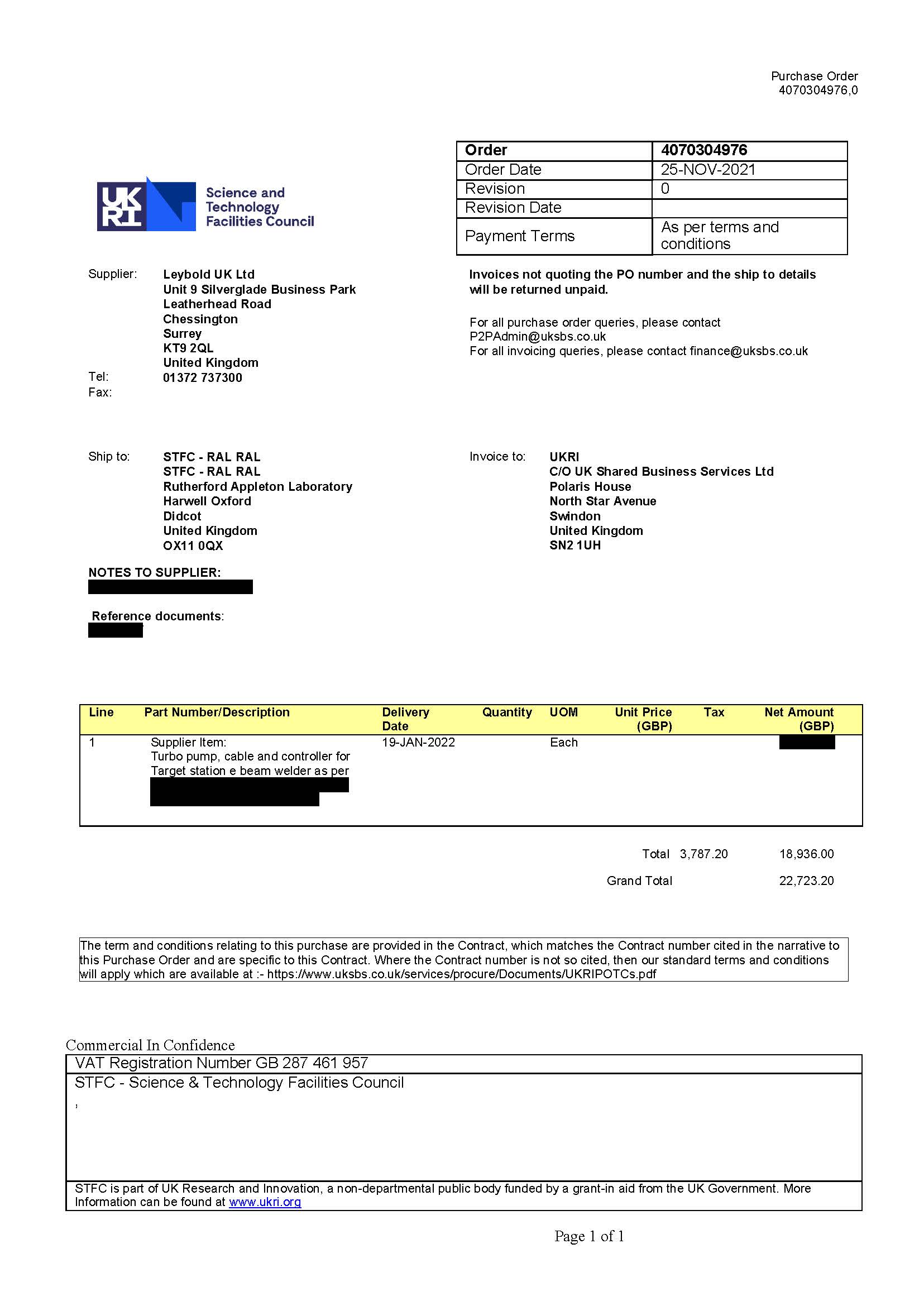 ***** THIS IS AN AWARD NOTICE, NOT A CALL FOR COMPETITION ***** This procurement is being concluded following a competitive quote exercise. Purchase order for a Turbo pump for UKRI - STFC