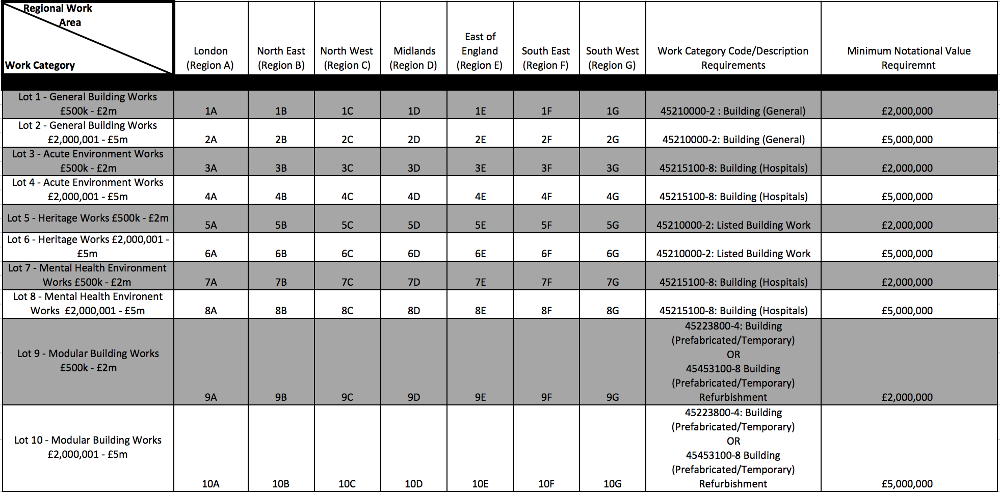 LPP are inviting applications from experienced suppliers of construction works to be appointed onto a national framework for construction works (valued between PS500,000 - PS5,000,000); to provide high quality works and services to Public Sector organisations in England. The framework shall be open to Public Sector Organisations including but not limited to LPP member bodies as listed at: http://www.lpp.nhs.uk/about-lpp/our-members/ , and any additional new LPP members for the duration of the Framework Agreement, subject to the approval of LPP. The framework will be segregated into 70 lots; made up of 5 works categories (split into 2 financial bands each), and 7 regions. Individual contracts under the framework will be awarded via the mini competition process. Eligible Contracting Authorities will select a relevant lot to engage appointed suppliers for their contract, and invite all suppliers under that selected lot to bid for the works. Additional information: For more information and to express an interest please follow the link below: https://procontract.due-north.com/Advert?advertId=10268d24-75d2-e611-80da-005056b64545&p=c8bf4a67-eab2-e611-8118-000c29c9ba21