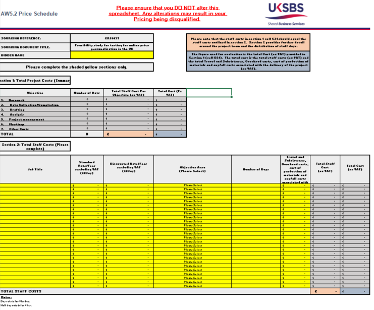 The final date and time for the submission of bids is Tuesday 18th June 2019 at 11:00. DO NOT apply directly to the buyer. All tender information MUST be submitted through the CCS eSourcing Portal. Brief Description of Requirement There is a significant opportunity for the UK to lead global understanding of the issues around price personalisation in online markets. This feasibility study will potentially contribute to wider work and be key to early policy development on this critical and emerging issue. Several jurisdictions have considered whether personalisation is occurring, but no significant policy development has occurred as a result of the research. Please ensure you review all attached information to ensure a full understanding of this requirement. All attachments can be found with the RFx attachments tab within the Emptoris System. This contract will be awarded based on the evaluation criteria set out in the ITQ document. How to Apply As part of the strategic alliance between UK Shared Business Services Ltd (UK SBS) and Crown Commercial Service (CCS), UK SBS will be using the CCS eSourcing Suite for this procurement. To register on the CCS eSourcing portal please follow the details contained within the Additional Information section of this notice. If you are already registered on the CCS eSourcing portal and wish to register your interest in this opportunity please email; expressionofinterest@crowncommercial.gov.uk Your email must clearly state: * the name and reference for the procurement you wish to register for; * the name of the registered Bidder; * the name and contact details for the registered individual sending the email. Please disregard any content in this notice that requests your organisation "to apply directly to the buyer" as this unfortunately a system generated error, that is outside of the Contracting Authorities control. Additional information: DO NOT APPLY DIRECTLY TO BUYER All submissions will be assessed in accordance with the Public Contracts Regulations 2015, for procurement values that exceed Regulation 5 (Threshold amounts) Responses must be received by the date in the tender documentation; responses received outside of the deadline or not sent via the eSourcing portal will not be accepted or considered further for this opportunity. How to Register on the CCS eSourcing Suite If you have not yet registered on the eSourcing Suite, this can be done online at https://gpsesourcing.cabinetoffice.gov.uk by following the link 'Register for CCS eSourcing'. Please note that, to register, you must have a valid DUNS number (as provided by Dun and Bradstreet) for the organisation which you are registering, who will be entering into a contract if invited to do so. Once you have registered on the eSourcing Suite, a registered user can express an interest for a specific procurement. This is done by emailing expressionofinterest@crowncommercial.gov.uk. Your email must clearly state: * name and reference for the procurement you wish to register for; * name of the registered Bidder; * name and contact details for the registered individual sending the email. Crown Commercial Service will process the email and then enable the Bidder to access the procurement online via the e-Sourcing Suite. The registered user will receive a notification email to alert them once this has been done. The Sourcing documents can then be accessed on the eSourcing Suite at: https://gpsesourcing.cabinetoffice.gov.uk using the instructions detailed in the Specification documents within Contracts Finder. As a user of the e-Sourcing Suite you will have access to Emptoris email messaging service which facilitates all messages sent to you and from you in relation to any specific RFX event. Please note it is your responsibility to access these emails on a regular basis to ensure you have sight of all relevant information. For technical assistance on use of the e-Sourcing Suite please contact Crown Commercial Service Helpdesk: Telephone: 0345 010 3503 Training documents to support Bidders to utilise Emptoris CCS eSourcing are available in the Contracts Finder Tender documents section. About UK Shared Business Services UK Shared Business Services Ltd (UK SBS) brings a commercial attitude to the public sector; helping our contracting authorities to improve efficiency, generate savings and modernise. Where UK SBS is not named as the Contracting Authority within the documentation, UK SBS will be acting as an agent on behalf of the Contracting Authority. Our broad range of expert services is shared by our customers. This allows our customers the freedom to focus resources on core activities; innovating and transforming their own organisations. For full details of our partne